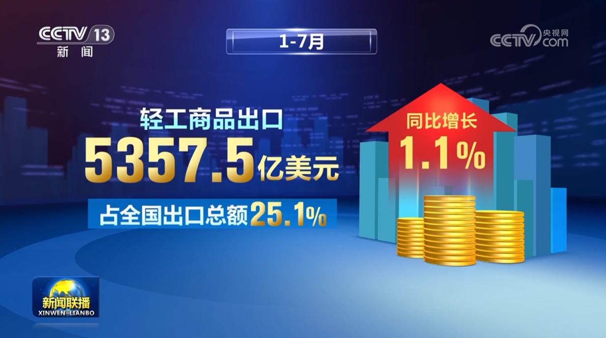 出口方面,继续保持韧性。1—7月,轻工商品出口5357.5亿美元,占全国出口总额25.1%,同比增长1.1%;21个大类行业中11个保持增长。